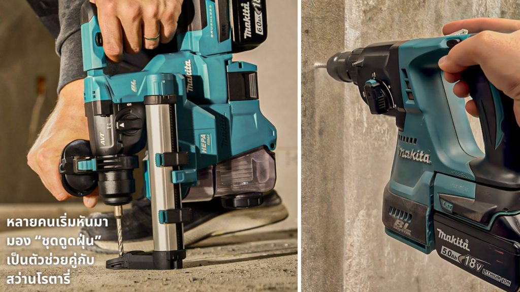 และหลาย ๆ รุ่นก็จะมีชุดดูดฝุ่นเฉพาะ ที่ติดเข้ากับตัวสว่านโรตารี่ โดยตรง บางรุ่นต้องใช้คู่กับเครื่องดูดฝุ่นภายนอก บางรุ่นมีช่องเก็บฝุ่นข้างไหน แต่ไม่ว่าจะเป็นแบบไหน เป้าหมายเดียวกันครับคือ “ตัดฝุ่นตั้งแต่ต้นทาง” ต่างจากการดูด หรือทำความสะอาดทีหลังโดยสิ้นเชิง